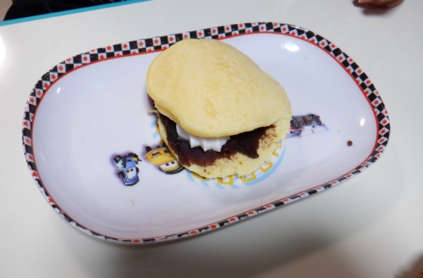 焼きあがった生地にあんこと生クリームをのせて、出来上がり(^▽^)/